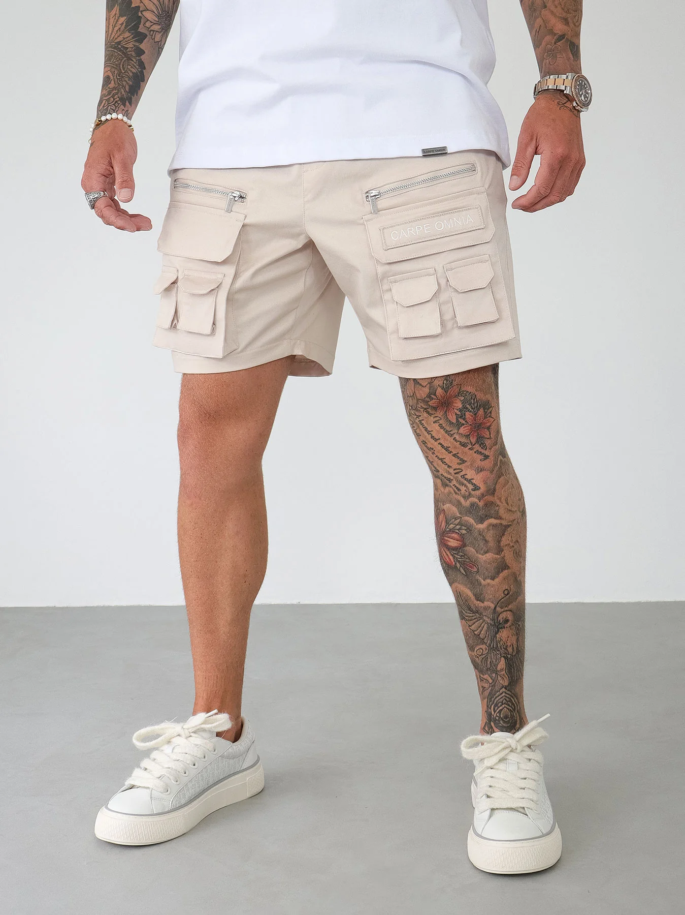 Beige Cargo Shorts with front CARPE OMNIA Pocket.